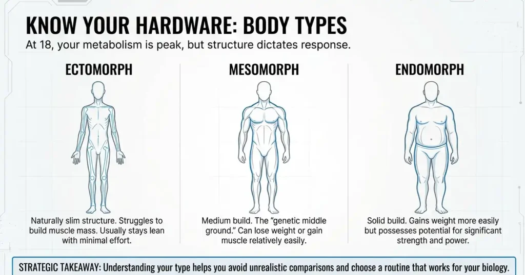 If you even think about changing your diet or workout routine, it is important to understand how your body actually works. At 18, your metabolism is generally faster compared to adulthood, which means your body burns calories more quickly. But this doesn’t give you a free pass to eat anything you want without gaining weight. Understanding your body type helps you avoid Unethical Ways to Lose Weight and choose a healthier, more realistic approach like beginner strength training plan and smart nutrition basics for fat loss.